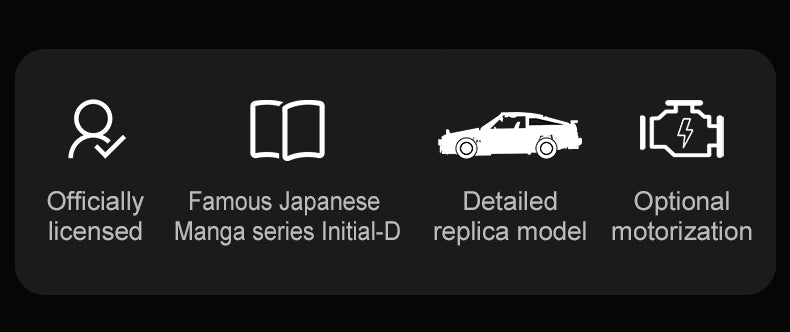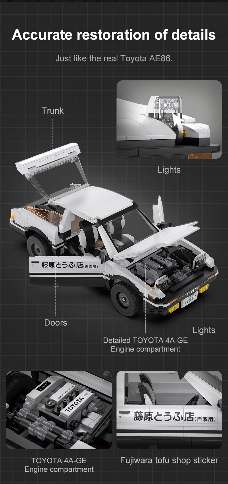 – Anime Faithful Design: Replicated jump lights, Fujiwara Tofu Shop box in trunk, and the legendary 4A-GE engine under the hood.
