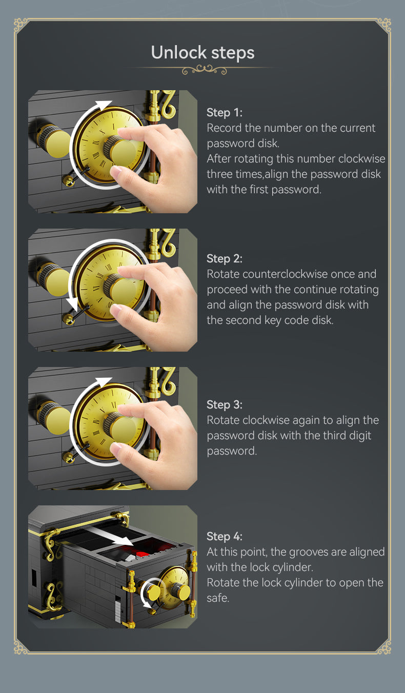 - **Mécanisme authentique :** Déverrouillez le coffre en alignant trois cadrans rainurés de précision, simulant une véritable ouverture de coffre.